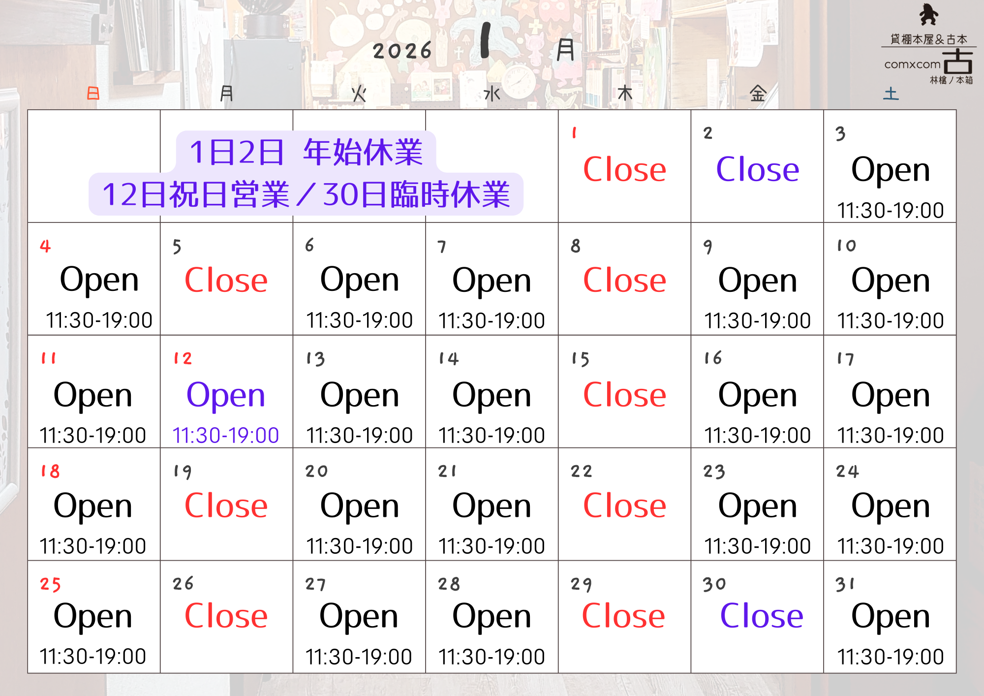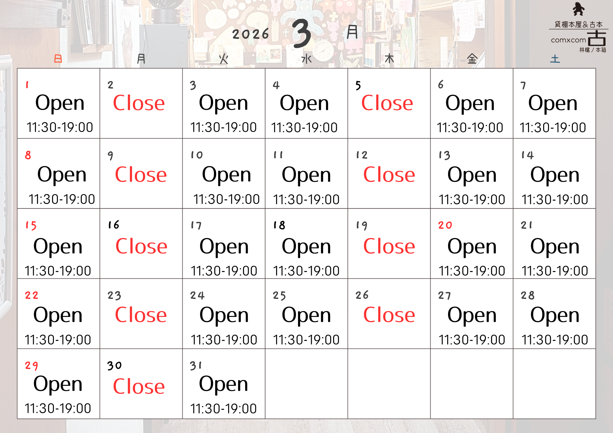 火水金土日11:30-19:00 Open(月木休み)不規則な場合あります。営業日カレンダーでご確認ください